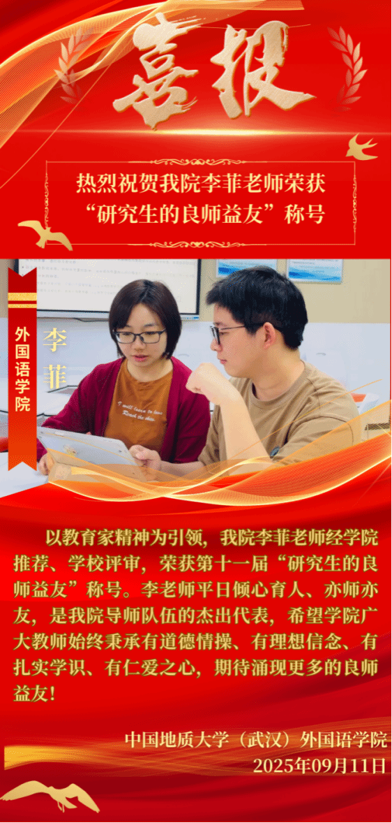李菲副教授的高尚师德也得到了社会与学术界的广泛认可。她参与的教学团队曾荣获多个教学荣誉和奖项,如2021年荣获“国家级大创项目优秀指导教师”、“暑期社会实践优秀指导教师”和首届教师教学创新大赛湖北省三等奖、2020年荣获外研社“教学之星”大赛英语专业组全国复赛一等奖等荣誉,这些都体现了她对学生全方位成长的支持与帮助。校外,她在知名科研培训中心(山东省国高教育研究有限公司)担任资深学术导师,系统性地开展研究方法专题线上课程教学工作,为来自全国多所高校的研究生及青年教师提供专业指导,显著提升学术素养和科研创新能力,助力学术职业发展。