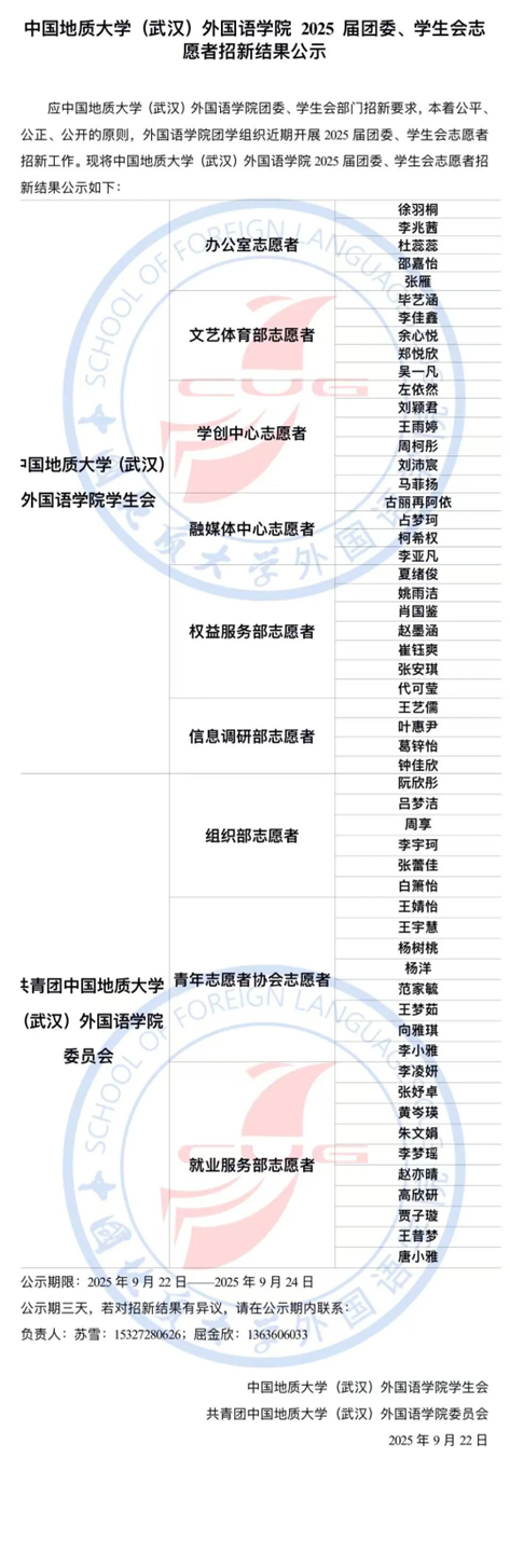 应3044am永利集团3044noc团委、学生会部门招新要求,本着公平、公正、公开的原则,3044am永利集团3044noc团学组织近期开展2025届团委、学生会志愿者招新工作,现将3044am永利集团3044noc 2025 届团委、学生会志愿者招新结果公示如下: